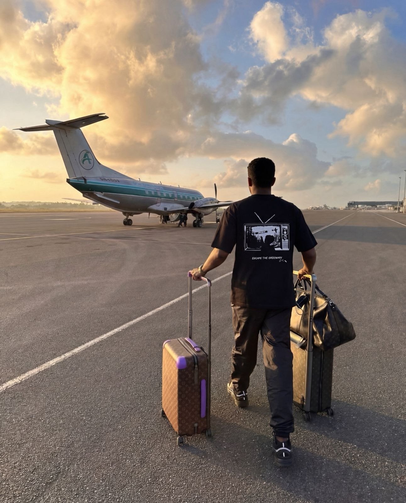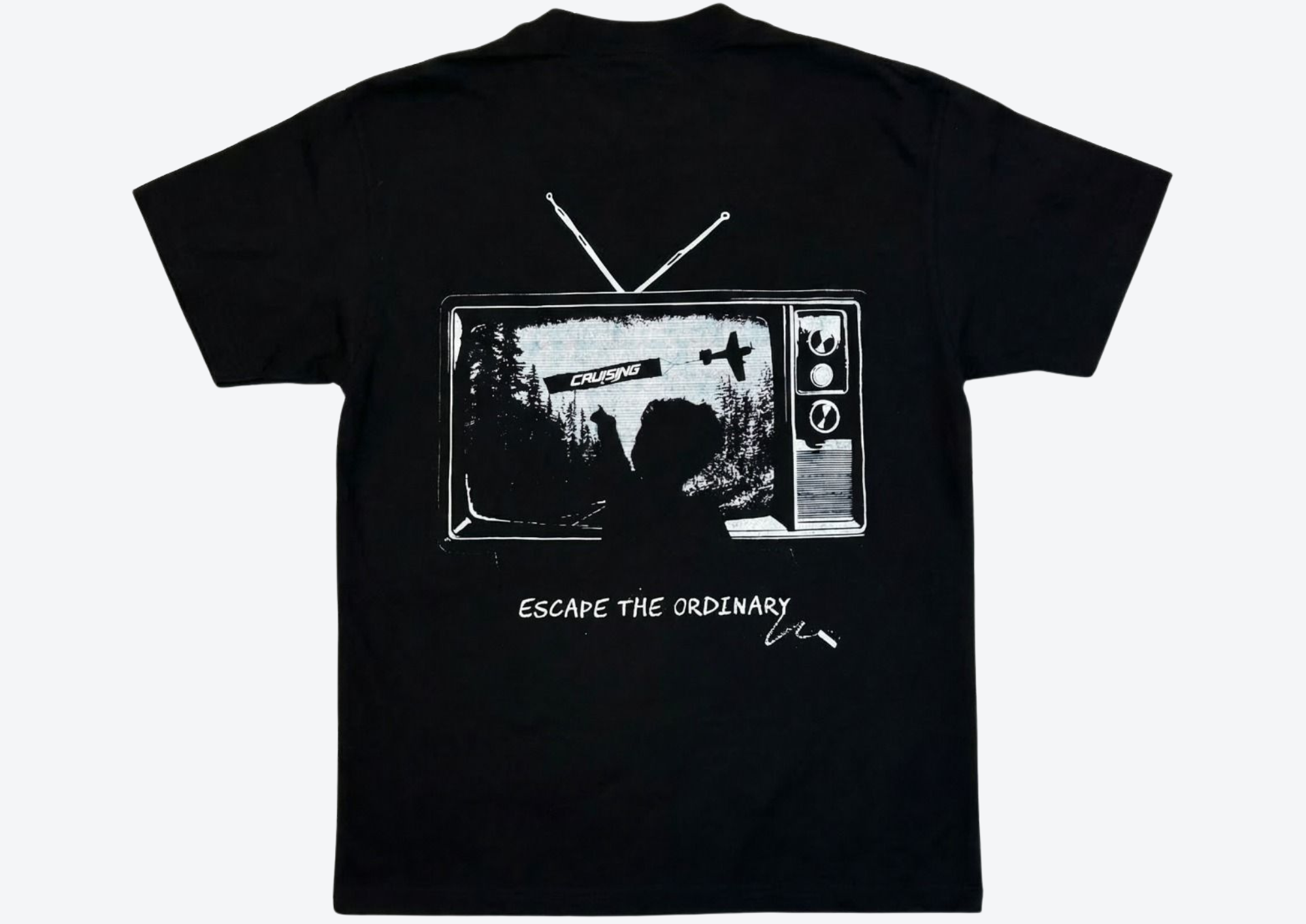 This premium black T-shirt features a striking monochrome illustration of a vintage television screen. Inside, a child gazes at a helicopter flying over forests, carrying the “CRUISING” logo. A design that captures the nostalgia of the analog era and the dream of escaping into the unknown.